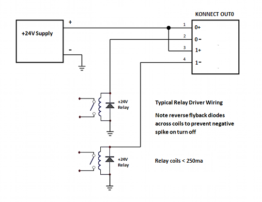 A typical wiring diagram driving 24V relays. Because of the less than 0.9V drop on the Konnect outputs the load will be driven with more than 23.1V.