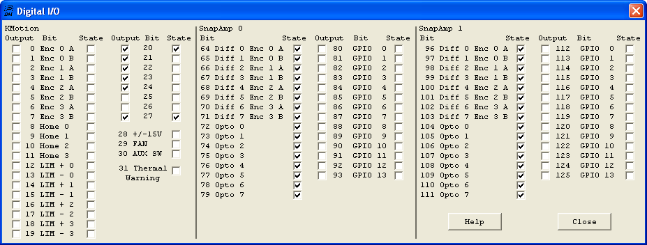 The Digital I/O screen displays the IO bits (numbers 64 - 93) for SnapAmp 0 in the middle portion of the screen, and IO bits numbered (96 - 125) for Snap Amp 1 on the right portion of the screen. The original KMotion I/O bits remain on the left portion of the screen. Note that KMotion I/O Bits 20-28 are used for the high speed communication to the SnapAmps and may not be used as user IO.