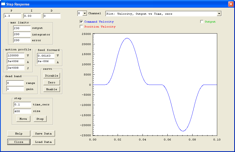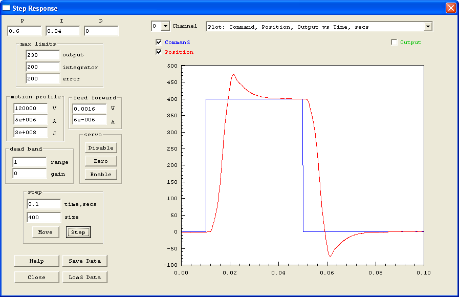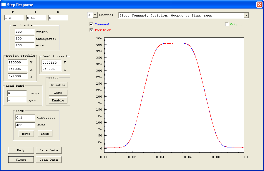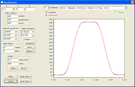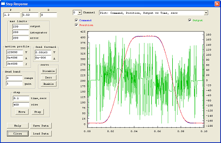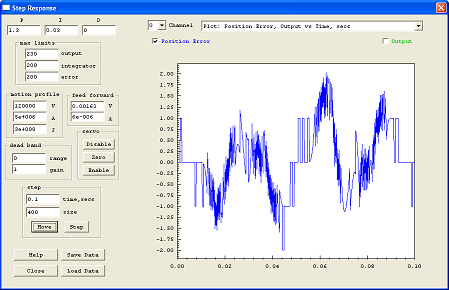 Окно настройки регуляторов и опережения (Step Response Screen) позволяет проводить измерения и строить график отклика системы с учетом профиля движения для настройки контроля положения или реакции системы на "ступеньку" для настройки регуляторов контроля скорости. График приведенный выше построен при значениях задания в 400 дискрет команды Step. Для увеличения изображения нажмите на него. Обратите внимание, что выходной сигнал содержит большие всплески. Это является результатом ошибки квантования по положению. Ошибка квантования возникает, так как в системе не было никакого движения, а потом внезапное, резкое изменение в одном серво-цикле. Это нелинейный эффект. В некоторых случаях этот "всплеск" может превысить диапазон выходного сигнала вызывая насыщение. Низкочастотный фильтр может быть использован для сглаживания этого эффекта до определенного предела. Слишком сильное сглаживание в конечном счете оказывает влияние на производительность системы, снижая запас по фазе. Как правило, частота среза фильтра нижних частот должна быть значительно больше, чем рабочая полоса частот системы.