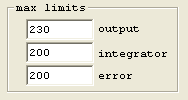 Предел интегратора (integrator) используется для ограничения максимального значения интегратора. Это часто используется, чтобы избежать эффекта "ветра". Рассмотрим случай, когда без ограничения интегратора каким-то образом поддерживается существенная ошибка в течение значительного периода времени. Например вал двигателя поворачивается вручную в течение нескольких секунд. В течение этого времени интегратор будет увеличиваться до очень большого значения. Когда вал двигателя будет освобожден, он будет ускоряться на максимуме и будет перемещаться около цели до тех пор, пока значение интегратора снизиться до приемлемого значения. Максимальный предел интегратора это предотвращает. Часто основной целью использования интегратора компенсировать статическое трение, чтобы снизить итоговую ошибку к нулю. Почти никогда не стоит устанавливать максимальное значение интегратора выше максимального значения выходного сигнала.