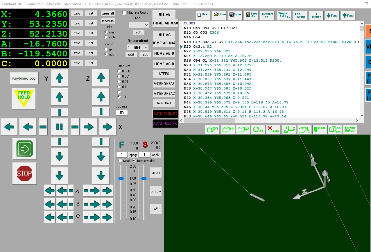 - rapid moves (with all 5 axis involved) sometimes exceeds the maximum linear axis setup (both in init.c and kmotioncnc trajectory planner axis parameters): for example if you play with single step the gcode line N18 the maximum linear FR is ok, if you play with "gcod START" it doubles in my case.