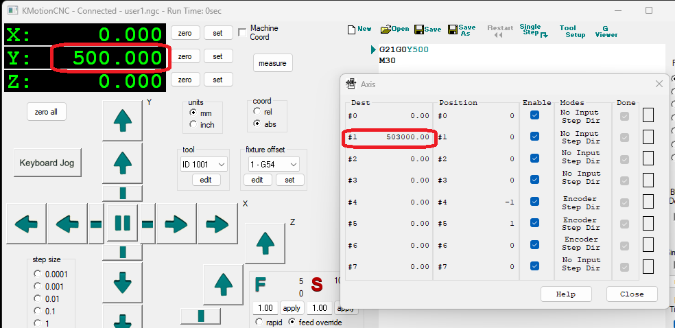 But even so the 503/500 scaling would initially be the same. Your file seems to work for me. Below you can see the GCode commands 500mm and the actual axis position is 503mm (I set 1000 counts/mm resolution)