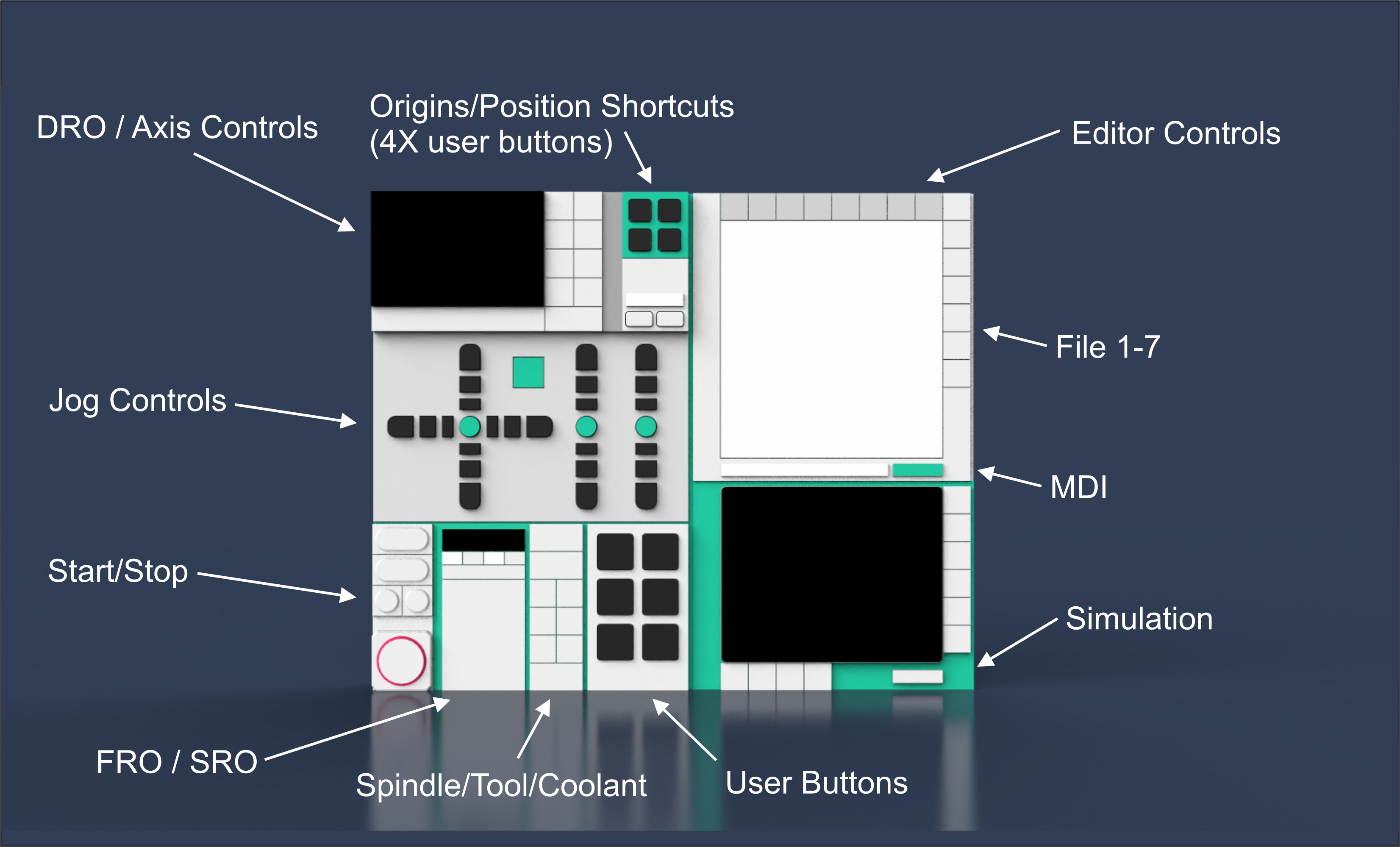 I am almost done the new layout, switched to a new resolution of approx 1000 *1200 so that the layout fits well on 1080 resolutions with room to spare on the screen for Kmotion Console, file explorer etc. Tried to take inspiration from real life CNC operator interfaces. I think I like the stacked editor and Sim, but they could easily go beside each other with a more "fullscreen" version (closer to 1920 wide)