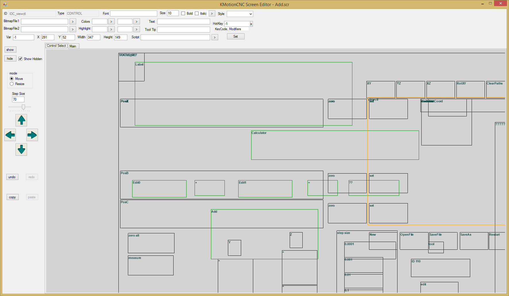 Select the "main" tab and change the Main Dialog Screen Width and Height such to include your controls.I've also run into a bug with the Screen Editor where the contents of the screen seem to have been scaled (after opening the add.scr). All the controls on the screen editor are very large and it's impossible to size my screen large enough to see them. I think it would be great if the whole "work area" were in a scroll-able view. See the screen shot.