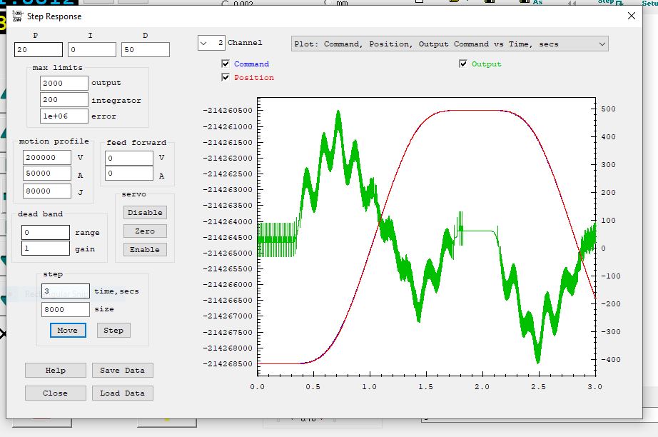 Notice the Output (green) peaks at about 400 DAC counts which is about 1/5th of the 2000 counts available. So you could probably accelerate several times faster that the 30,000counts/s2 in this test.