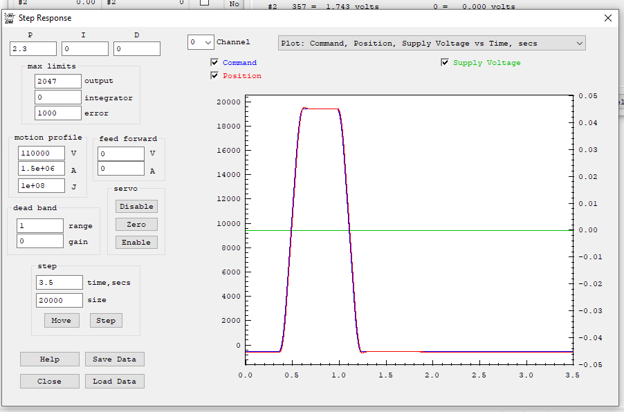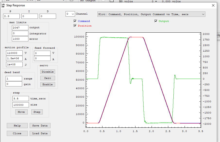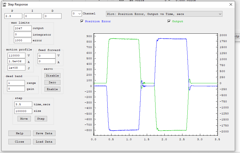 I turned off the dead band and added D and I. Corrected the clerical error on filter screen ( Q to 1.4) Tried to raise the P after adding D, but caused oscilation on longer moves. With the shown settings the axis is returning to the same encoder count and a travel indicator shows the actual position is also returning to the same position. Could you explain which plot you are looking at to see the following error and how to read it? If I did the save right, I saved two different size moves for your evaluation. I added the I to try to correct the following error, but since I do not see how to read the result I don't know if it is improved. Is the error you are talking about the traveling error before it reaches the final destination? If not then why does it show returning to the same start point? Sorry to be so slow to follow.