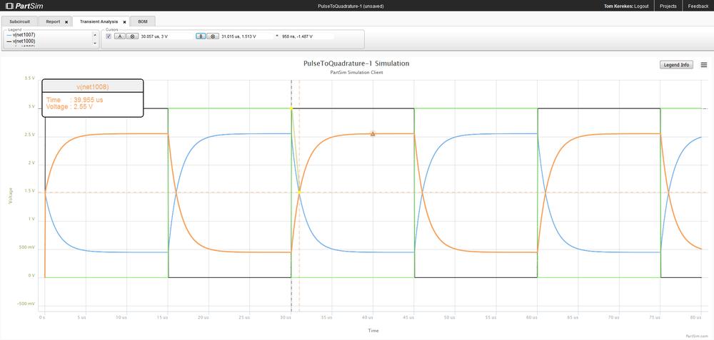 It shows a spice simulation on how a 3V differential signal (black/green square wave traces) can be converted to a delayed 2.5V differential signal (gold/blue traces) using two 100ohm resistors and one 0.01uF capacitor.