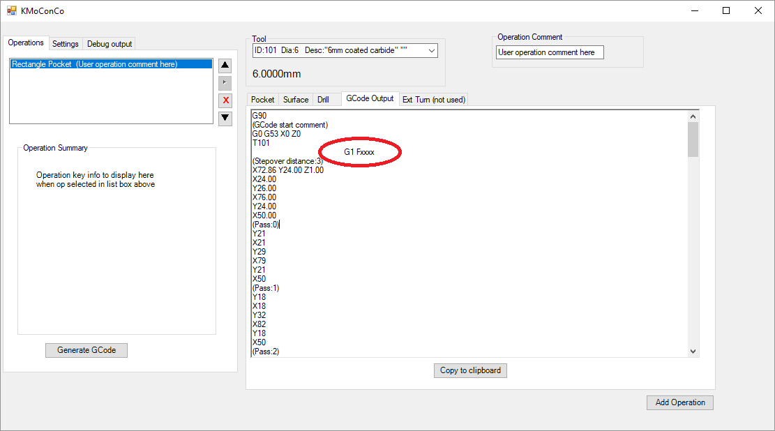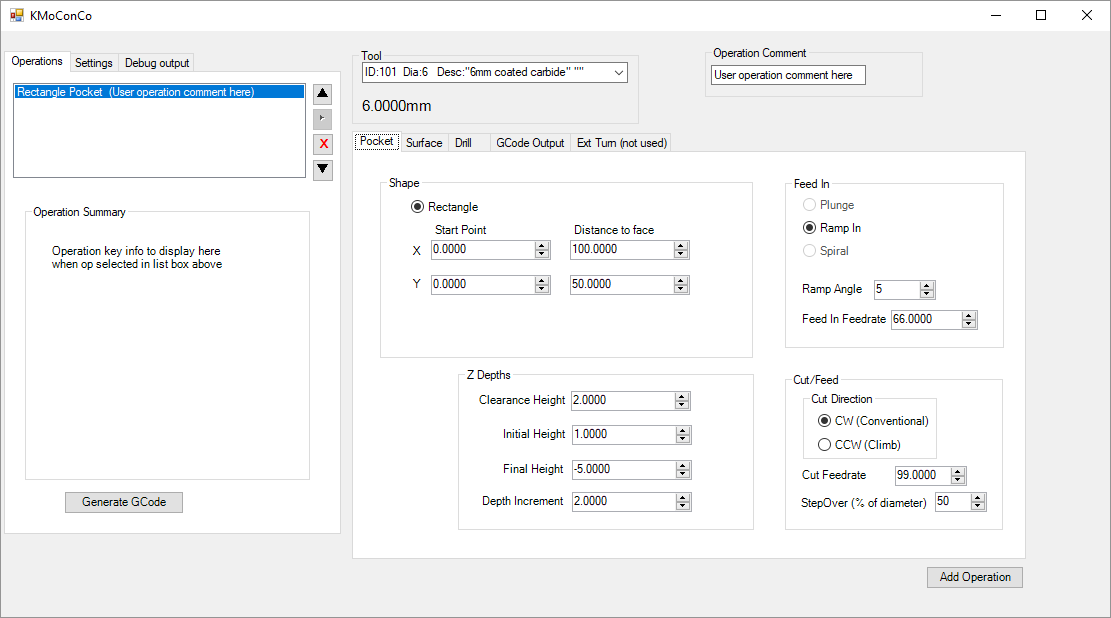 Gcode start/end/toolchange textboxes added and now functionalThe basic functionality works (key bit I definitely still need to add is the ability to edit an Operation already added to the Operation list), and it will let you create Drill Cycles in various patterns, Surface, and Pocket (currently only with a ramp in move).
