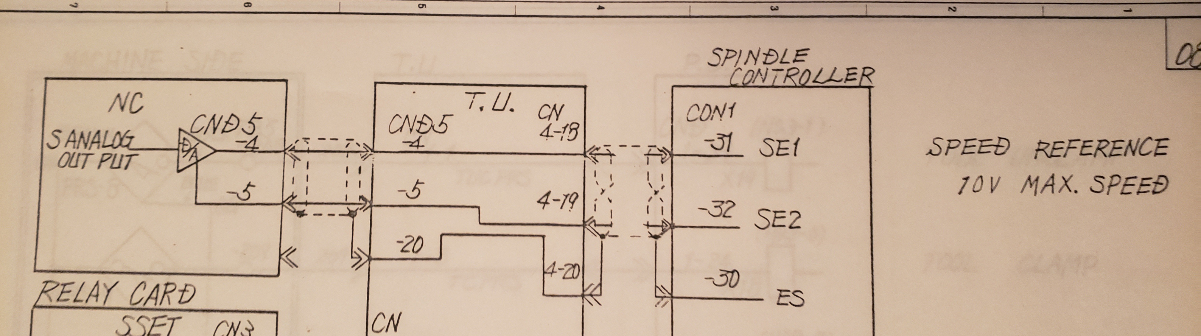 I'm working on figuring out all of the pins that I need to connect on my mill, and I came across the spindle speed control which I don't really understand. It says it's 10V max which is nice since it can plug directly onto a Kanalog DAC pin. I've removed the Numerical Control(NC) unit. The TU is just a box that routes individual wires between different cables. I'll be connecting to the CND5-4(SE1), and CND5-5(SE2) wires.