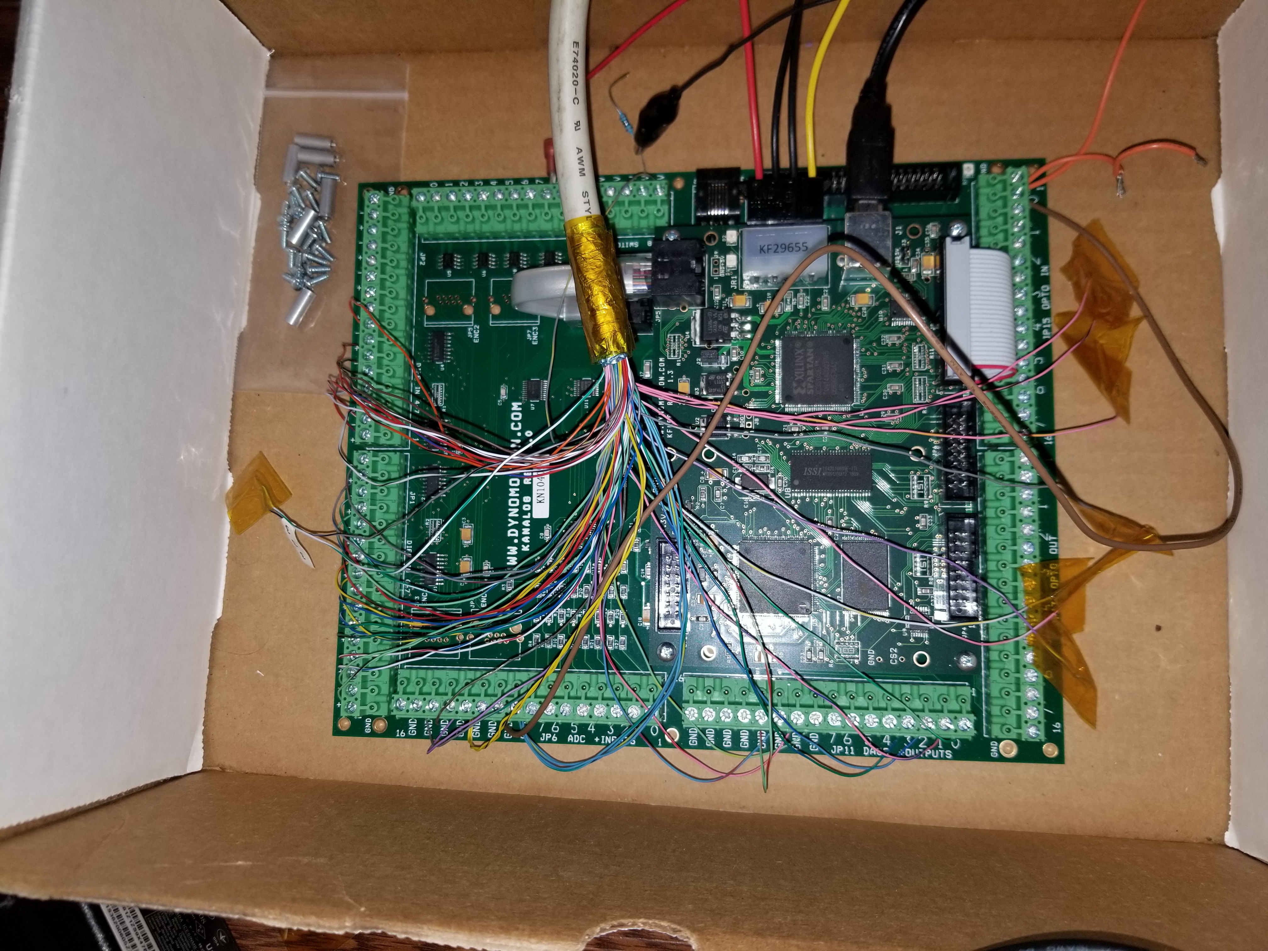 Hello Tom! It seems that you field all of the support for the Dynomotion product line. I guess this is the best forum section to start this particular string of questions and to start off my project utilizing your board. I came upon the kflop because I recently bought a techno Isel router table at auction which was missing the PCI "brain" board, and needed a motion control solution that could handle analog dc brushed motors. I have scratch built a 3d printer and another router table that worked under 2 different motion controllers but this is my first foray into servo motors and C+ based firmware. I have broken down the SCSI cable that acts as the wired connection between the box which houses the power supply and servo amps and the original PCI "controller" card, and connected it to what I think are the appropriate screw terminals on the kanalog board. I have tested the servo amps directly with 1.5V battery as analog input and gotten a motor to turn. Now I am at the point where I want to get a motor to turn via a jog button in the control software and I am playing with the Kmotion interface. I loaded Kmotion and configured the 0 axis and hit the save, compile, download, run button. My first couple questions arise from the following, I figured out that the opto in at J15 needs power so I took 5V+ from the kanalog and hooked it to 0+ and made the limit switch for the axis I am testing (the limits on this machine are 2 micro switches wired in series for home and limit per axis) brake ground on the 0- terminal. When I go to the digital I/O tab in Kmotion all of the home and limit state boxes randomly cycle on and off but the kanalog opto in bit 136 functions as I expect (depress a limit microswitch and state check mark goes away, release switch it comes back) I don't know if that is normal or not for state boxes on the kflop page to cycle. The cycling of state on the home and limit boxes freaks me out. I have crashed my other machines more than once because of limit switch issues. My other question is based on the encoder and dac side. When I first connected via laptop to the kanalog and started poking around Kmotion, I got a voltage reading on the DACs side of analog I/O when I manually turned the encoder but after loading a config onto the board and dorking with wiring to the limit switches now I don't see a change there. I do get a change in position on the axis page though. Am I ready to try a jog button for this axis in KmotionCNC or do I have a problem with the home and limit and or encoder? Thank you in advance for any help. Sincerely, Dave.