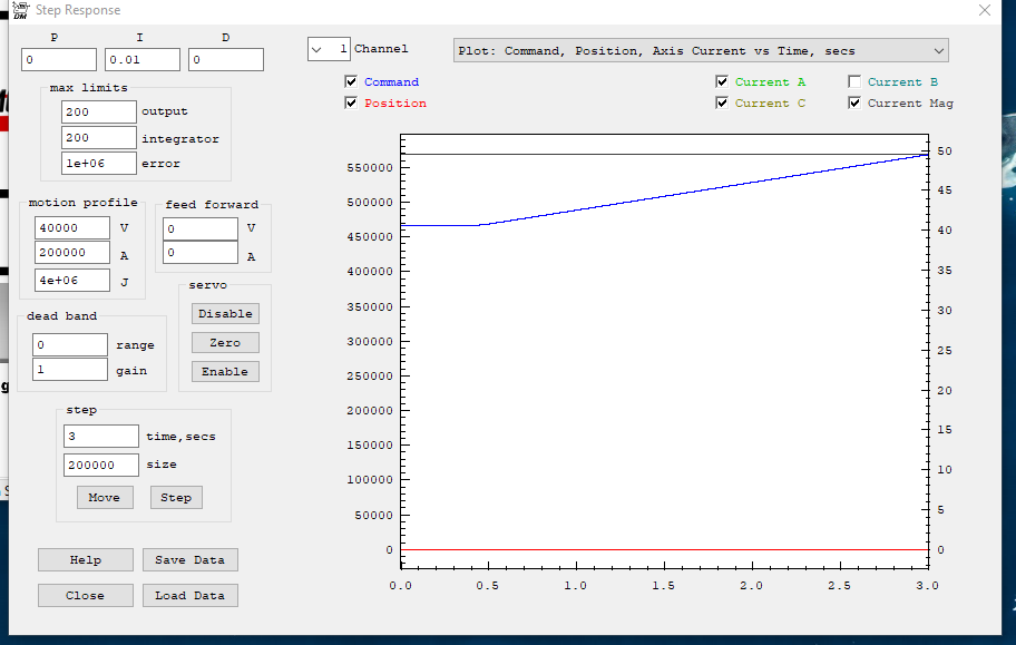 The problem could be a bad motor. Channel 1 is the master of Channel 3 that both drive the Y axis. I have removed the motors from the ball screws for easy visual aid. In step response channel 1 moves drives both 1 and 3 properly to my eye. In channel 3 the move drives only itself properly. I have downloaded the config data to both InitKSep3AxisSlave.c and InitKStep4Axis.c, saved it, compiled, downloaded it, and ran it. Only 4Axis addresses channel 3 which is currently loaded.When jogging the Y axes Motor 1 works properly Motor 3 attempts to turn but just gets maybe 1/4 turn.