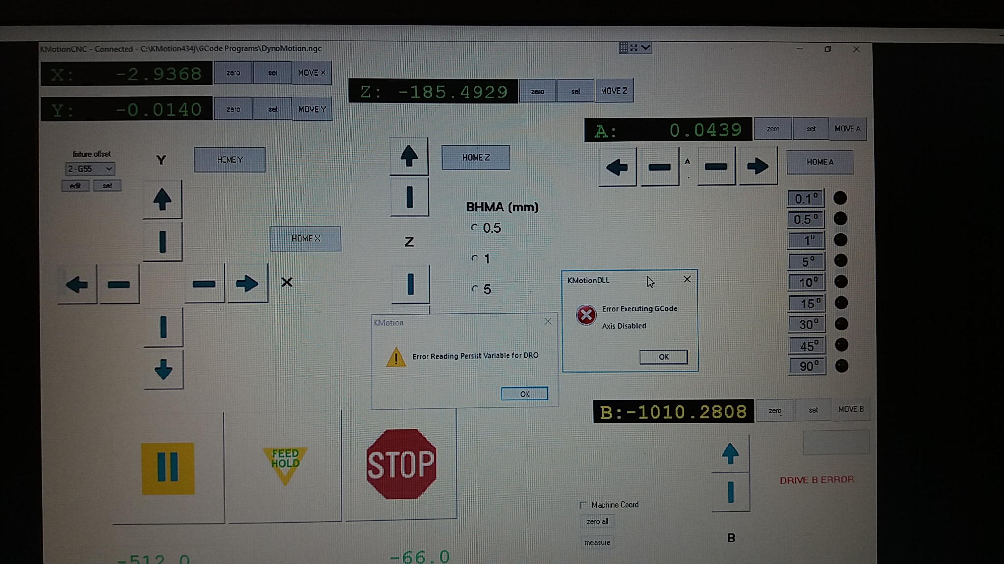 That makes sense. You can not run GCode or MDI commands if all the Axes in the defined Coordinate System are not enabled. If you want to run GCode or MDI commands with Axis B disabled then B should be removed from the Coordinate System beforehand. See the example code below. A better approach might be to have the B axis normally excluded instead of included and only include it when the B axis is enabled. That would seem more logical to me and might avoid other issues.