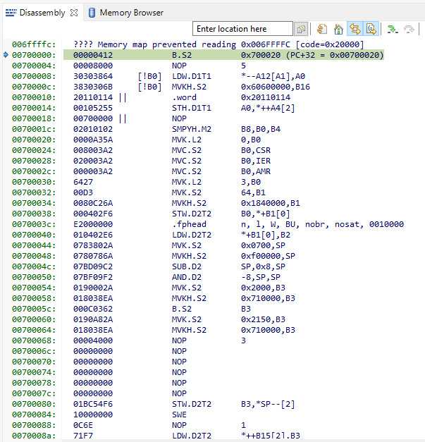 0x00700000 - 0x007FFFFF is the DSP's internal Boot ROM. If it is stuck there then the code most likely crashed and fell into the Boot ROM.do you know what's at address 0x00712148? It's an IDLE instruction and it seems to be stuck there. Even though I load symbols for the firmware and my code, it doesn't know that location, although it looks like legit code in the disassembler. I guess it could be my code from other threads, but it's beyond my patience and understanding to load all our code one by one to find it. But that address doesn't look like the normal thread space (?)