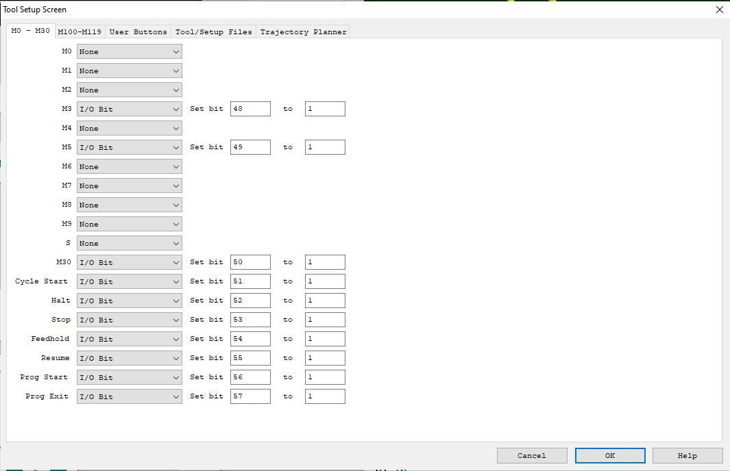 I try it but did not work as expected. I assign a toglle button on the screen, with a var 1026 to exec/wait my c program. When i press this button then the program is executed. Also i assign to the M3 function on the tool setup screen on the KmotionCNC a variable 48. This 48 variable is checked in my endless main loop and when goes true, then a function is called, which makes the 1026 variable true, "SetBit(1026)". When a M3 is executed in a Gcode program, the only think happens is the variable 1026 goes true, but the c program assosiated, with this variable/button does not execute.