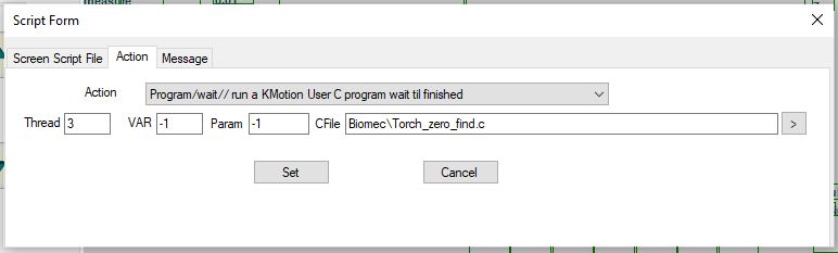 I try this "ScreenScript("WinMsg:Keyboard;;KeyPress;122");" in the endless loop, in the function that handles M3. I also assign to the user button 9 the action Exec/Wait to c function Torch_zero_find.c, with key = 122 = "F11", via Tool setup on KmotionCNC.