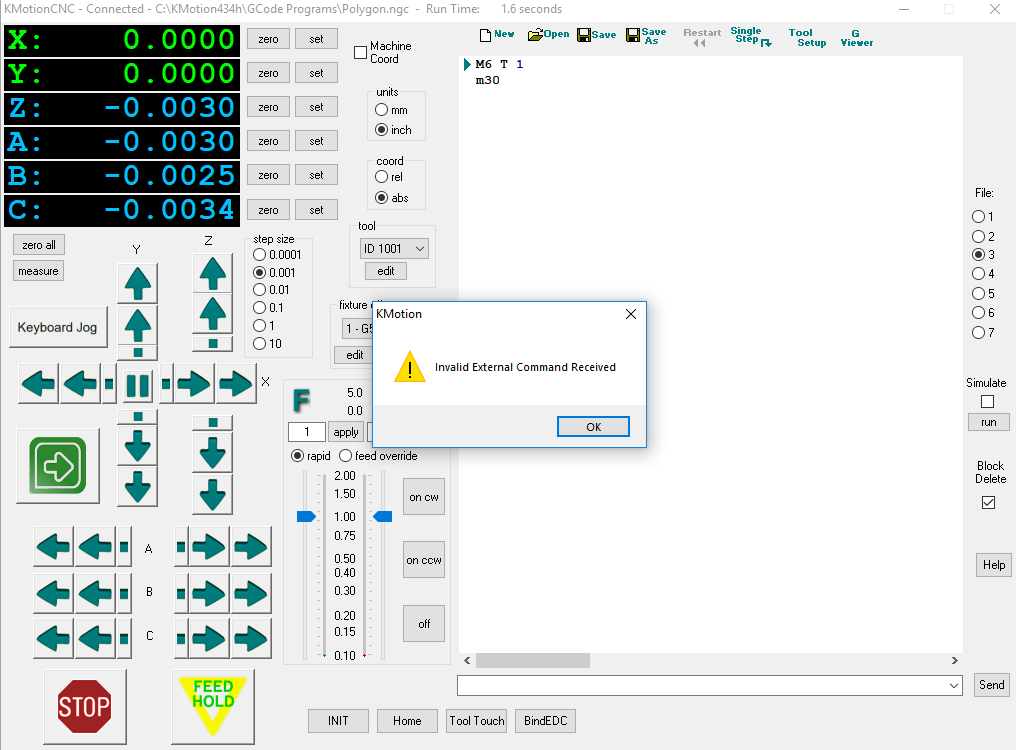 I am getting a strange error that I don't understand while running a C Program. A display window pops up in KMotionCNC which says "Invalid External Command Received". I have attached a screen shot. The only way to make it go away is to reboot the KFlop. I am running 434h.