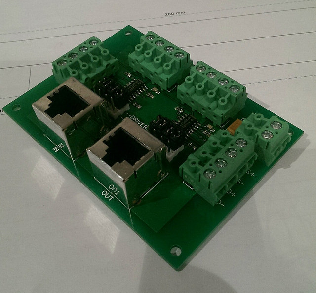 Regarding the differential outputs, if you're interested, I've got a batch of PCBs for outputting the JP5 step/dir outputs to differential outputs. They have two RJ connectors for input/output, with jumpers to select if signals are passed straight through from the input RJ to output RJ, or diverted to line driver chips, with the differential outputs going to the same pluggable connectors as other Dynomotion boards use.