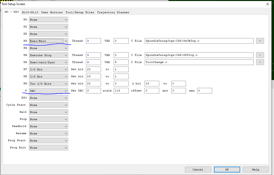The relationship that KMotionCNC has with those programs is determined by whatever is in the dropdown box, say EXECUTE. Each of these programs appears to run in its own thread, hence the issues with this Spindle delay, where EXECUTE just launched the Spindle start program, and then carried on before the delays timed out.