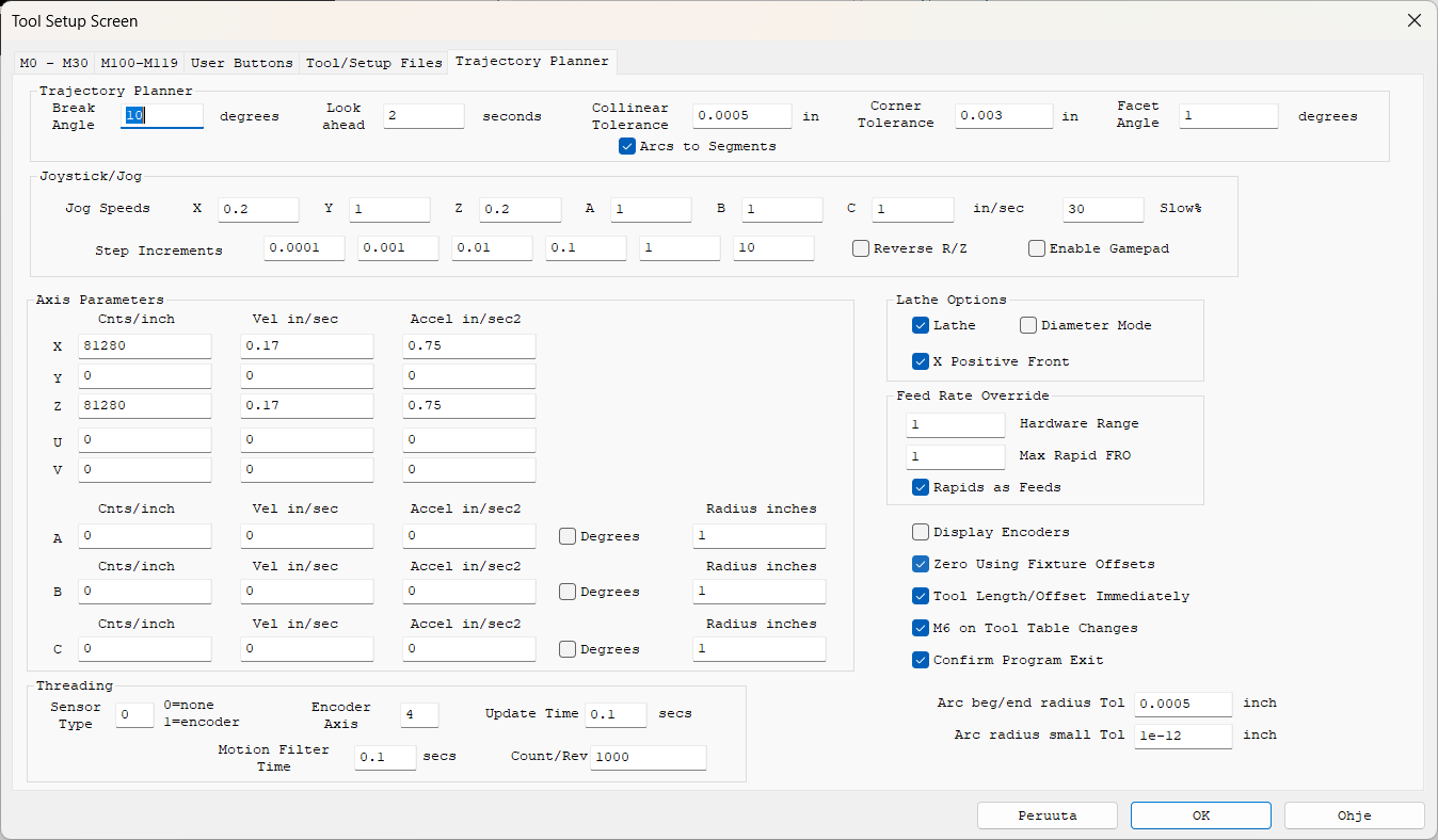 I have a problem that the rapid feed moves in KMotion CNC are not following the settings in the KMotion Step Response screen Velocity, Acceleration and Jerk. They are much faster and cause the steppers to stall. I've checked that the settings the settings are correctly downloaded to the Init.c program. I've as well checked the Trajectory planner settings in KMotionCNC. Tried to lower the rapid moves feedrate from the Trajectory planner as well, without any effect in the speeds.