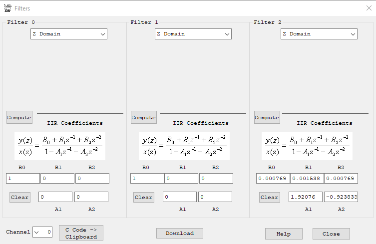 I can't remember this ever being discussed, so in KMotion, why are the default IIR Filter 2 values set to seemingly random values, whereas as 0 and 1 are 1 and 0's?