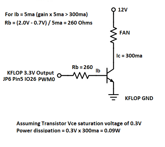 Here is a Resistor+Transistor circuit connected to a KFLOP 3.3V Digital Output to turn the Fan on and off. If the Transistor has a gain (hfe) of 100 then only 3ma of base current is needed to fully turn on the Fan of 300ma. To control Fan speed you will need to pulse the fan on and off at some frequency and vary the duty cycle (% of time on) this is called PWM (pulse Width Modulation). If you have JP6 pins available a KFLOP Hardware PWM can be used to make things easy. Otherwise you will need to write software to pulse the output on and off.