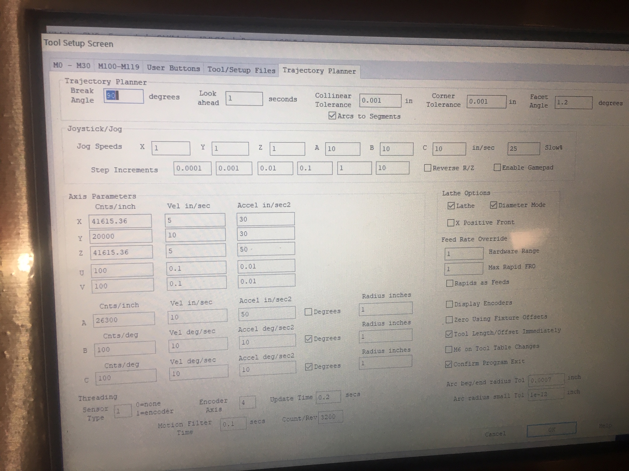 See attached photos. The C program is running in thread #3. I see where there are other C programs called by Mcodes and user buttons calling that same thread (#3) but I'm not activating those. I'm just running the G code program until it stops. Is there still some interference there?