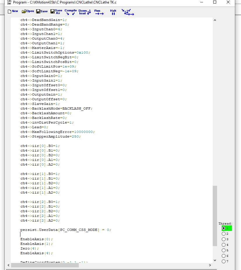 I know you have to respond to many questions every day and thus you probably would not remember, but my second post in this exchange says the same thing about the spindle. It worked after you tuned it up when you had control of the computer. Now it does not and I have not messed with any of the programming since you finished, and have not changed any connections in regard to it. I also mentioned my other lathe you tuned a couple of years ago does the same thing. It accelerates to a high speed as soon as kmotion is initialized , then slows to a stop, reverses and goes the other direction and continues this cycle a few times getting less force full each time and eventually settles down to zero speed and is then good for the rest of that initialization cycle. This lathe cannot complete this action because it does not have enough supply power to accelerate that quickly. The DC drive trips out. I will attach the copy of the TK C program here. Please let me know if you want to see any other programs under the CNC Lathe main file.