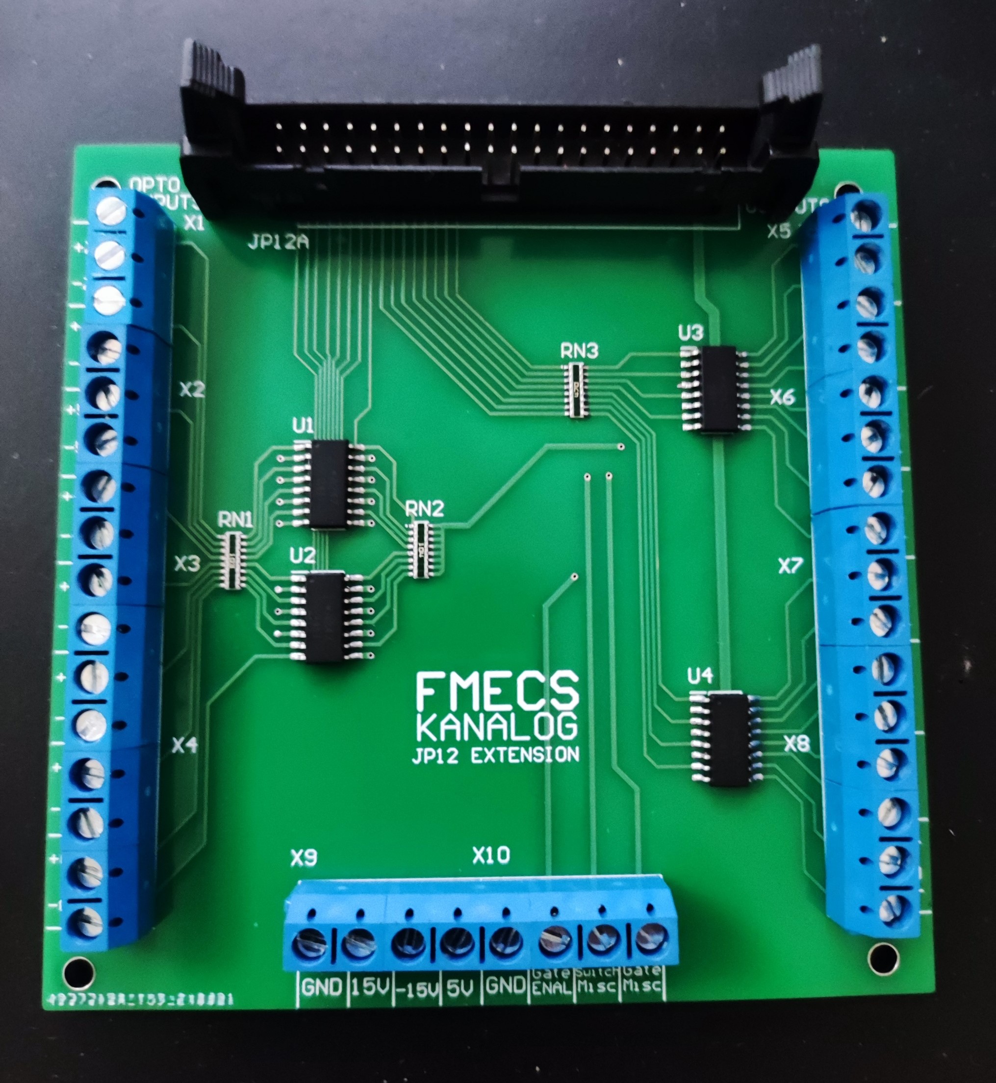 The card has 2x16 screw terminals, with a 5mm pitch for the digital IO's and 1x8 for the FET signals and the power, +-15.0V, 5.0V, and two GND's.