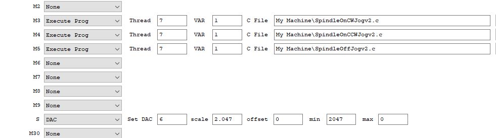 I used the "SpindleOnCWJogV2.c" and the other 3 files for CCW, Jog and Off and modified the CW and CCW bits and SPINDLEAXIS. See attached modified SpindleOnCWJogV2.c.