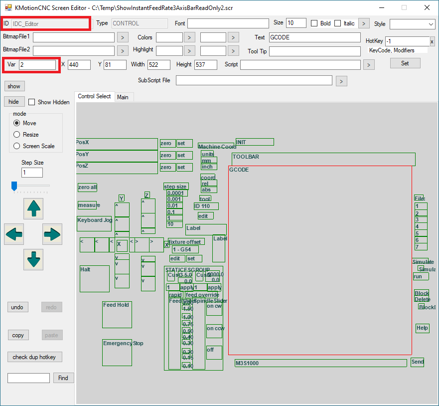 The Screen Editor can be used to set the Var parameter for the GCode Editor to either: