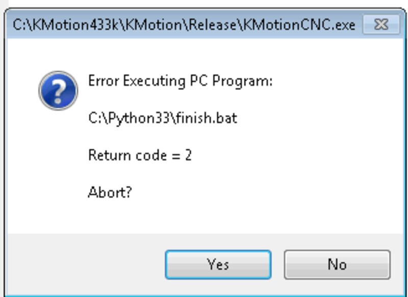 I am having trouble executing a Python program using an M100 code. I am trying to use the "Execute PC" function and then point directly to the file location. This causes and error. I made a .BAT file that executes the python program but it also gives an error. Both the BAT and the python executable function when I try to open them directly.