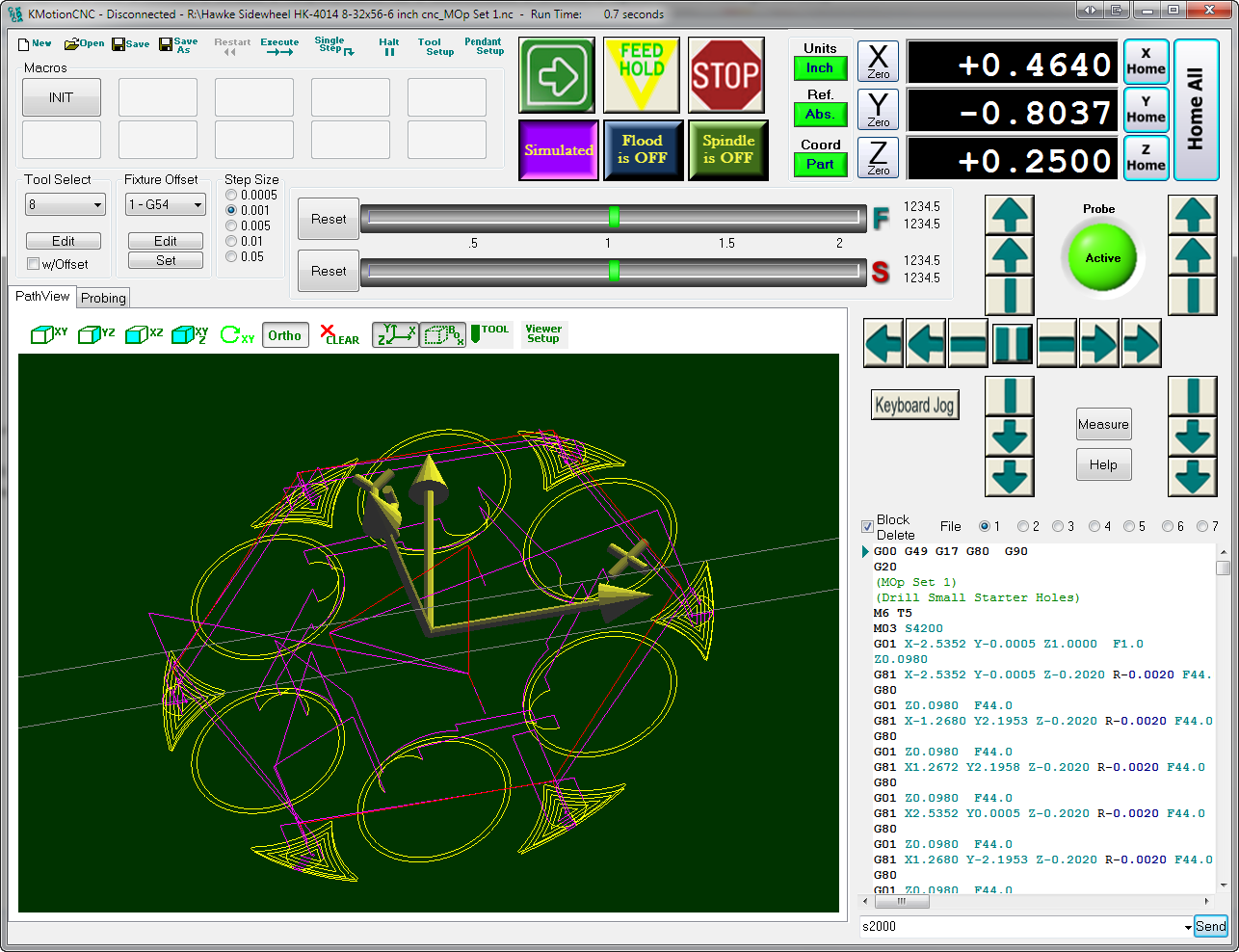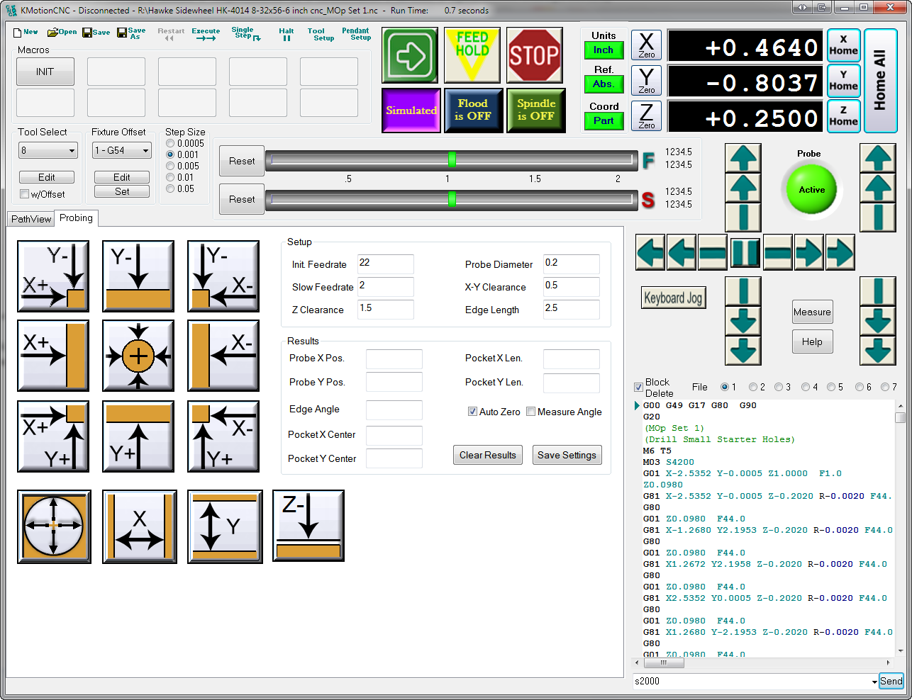 In KMotionCNC, I have to setup for my M3 definition as Execute and Wait. (Simply using Execute doesn't appear to create the delay I want). This seems to work well, however if my probe is plugged in we get into a race condition and the GCodeInterpreter gets stuck in a loop waiting for a non "0" response from a WriteLineReadLine("CheckThread command. So on one hand, the .c file is in a loop waiting on a signal from KMotionCNC that the MsgBox command has finished, and the GCodeInterpreter is also in a loop waiting for the thread to finish. The GCodeInterpreter loop is preventing the KMotionCNC code from responding to the message to bring up the MessageBox. Any insight on how to handle this better? Eric