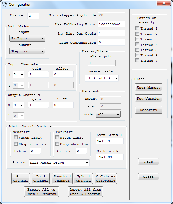 Yes the screen shot looks correct. But "OutputChan2=8" is incorrect and invalid. In some Output Modes a KFLOP Axis Channel can require 2 output devices. They are called OutputChan0 and OutputChan1. Step/Dir Mode only use one Step/Dir Generator device so only OutputChan0 is used to specify
