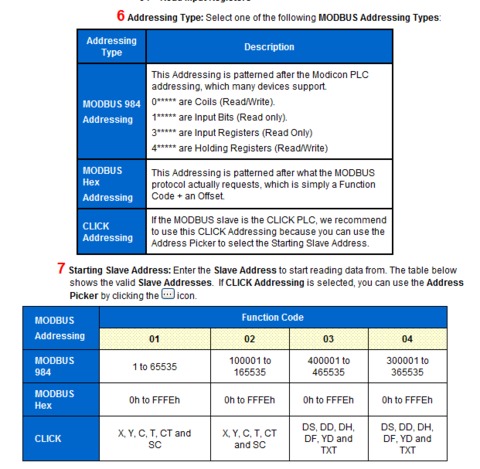 addresses. If I'm understanding the code correctly, for the read, the high address is xE0, and low x00, yet the corresponding bits in Click are 0001 to 0008 hex. And for the write, we have xE2 and x00, which somehow translate to 2000 hex upwards. Having just typed that, I notice combining them has a pattern, but how E0 give 00, and E2 give 20? All I'd like to acheive over modbus just now, is read inputs X6 and 7 on the PLC and store them to virtual bits, read the value stored in DS1 and store it in a user variable, and write a new value to DS2. Thanks Moray PS. If only the Konnect had been launched a couple weeks earlier, I would of been saved the pain of setting up this PLC!