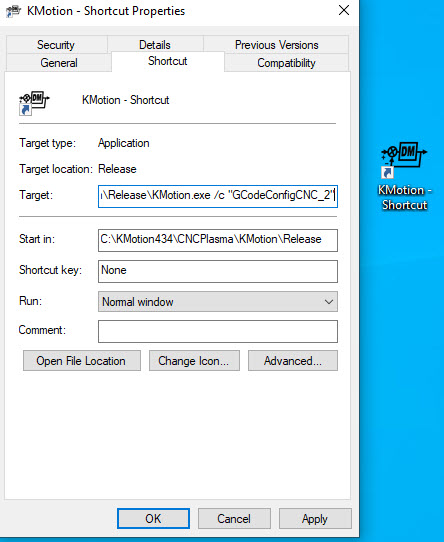 - C:\ ... Release\KMotionCNC.exe /c"GCodeConfigCNC_2"