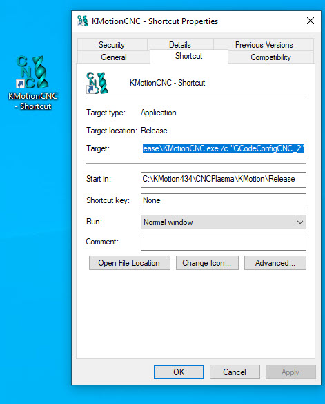 - C:\ ... Release\KMotionCNC.exe/c"GCodeConfigCNC_2"