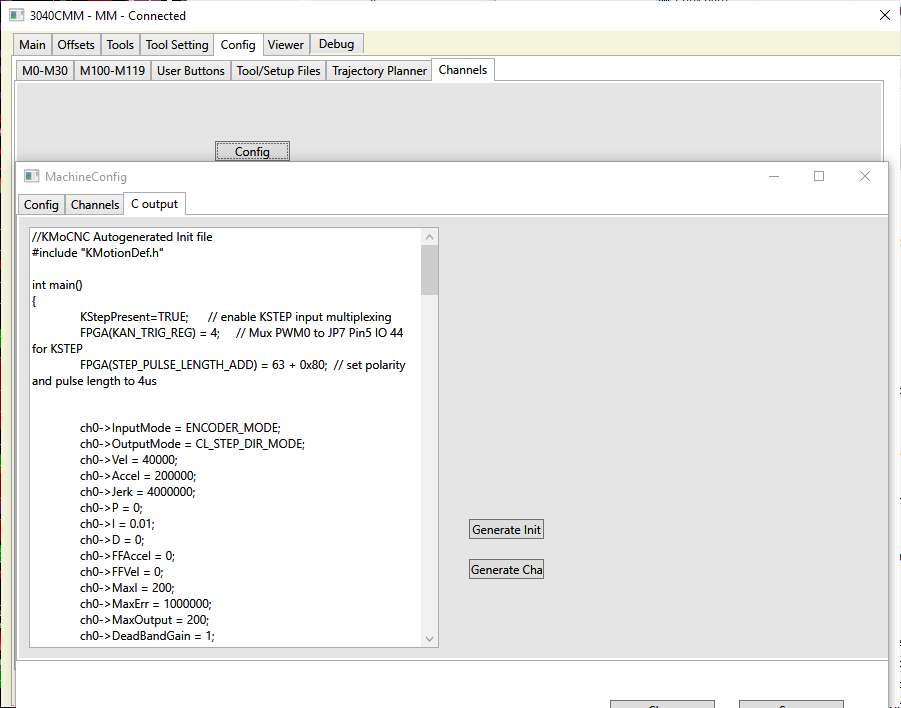 C Output tab. Generate Init, will generate the init file from the settings in the other tabs, and display in the text box.