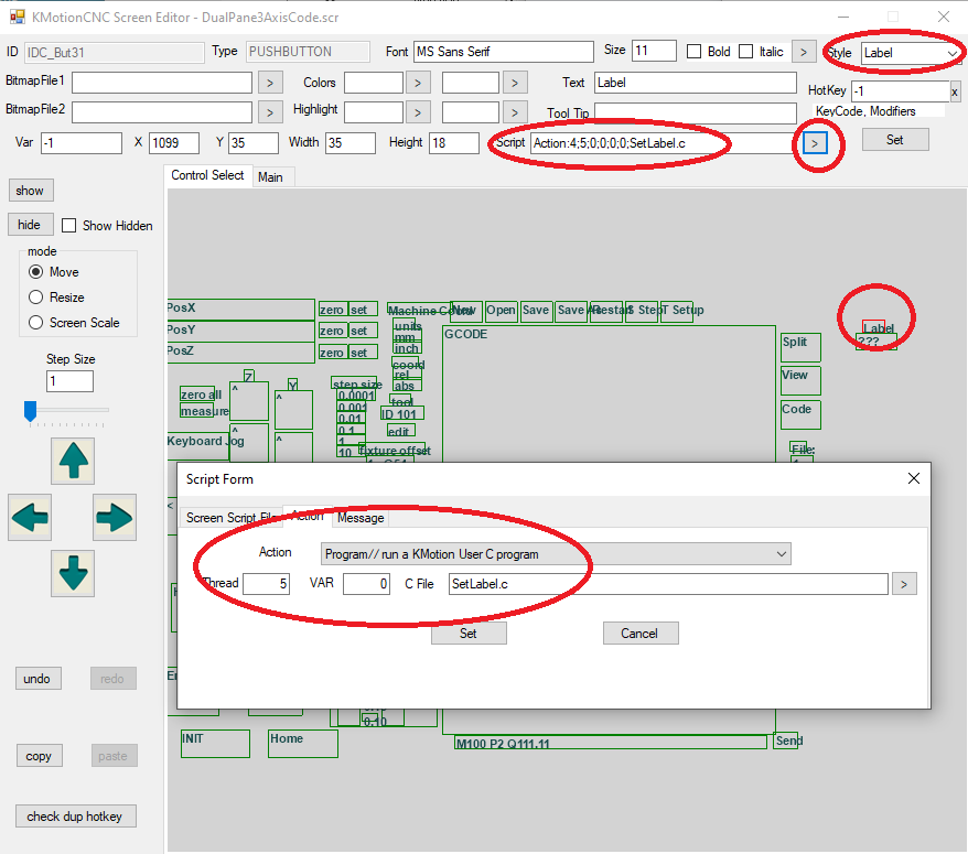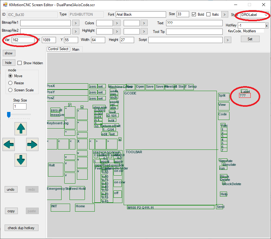 So for example here is the example DualPane3AxisCode.scr with a new DROLabel and simple Label added. The DROLabel will be initialized (to 1234) whenever the Screen Loads: