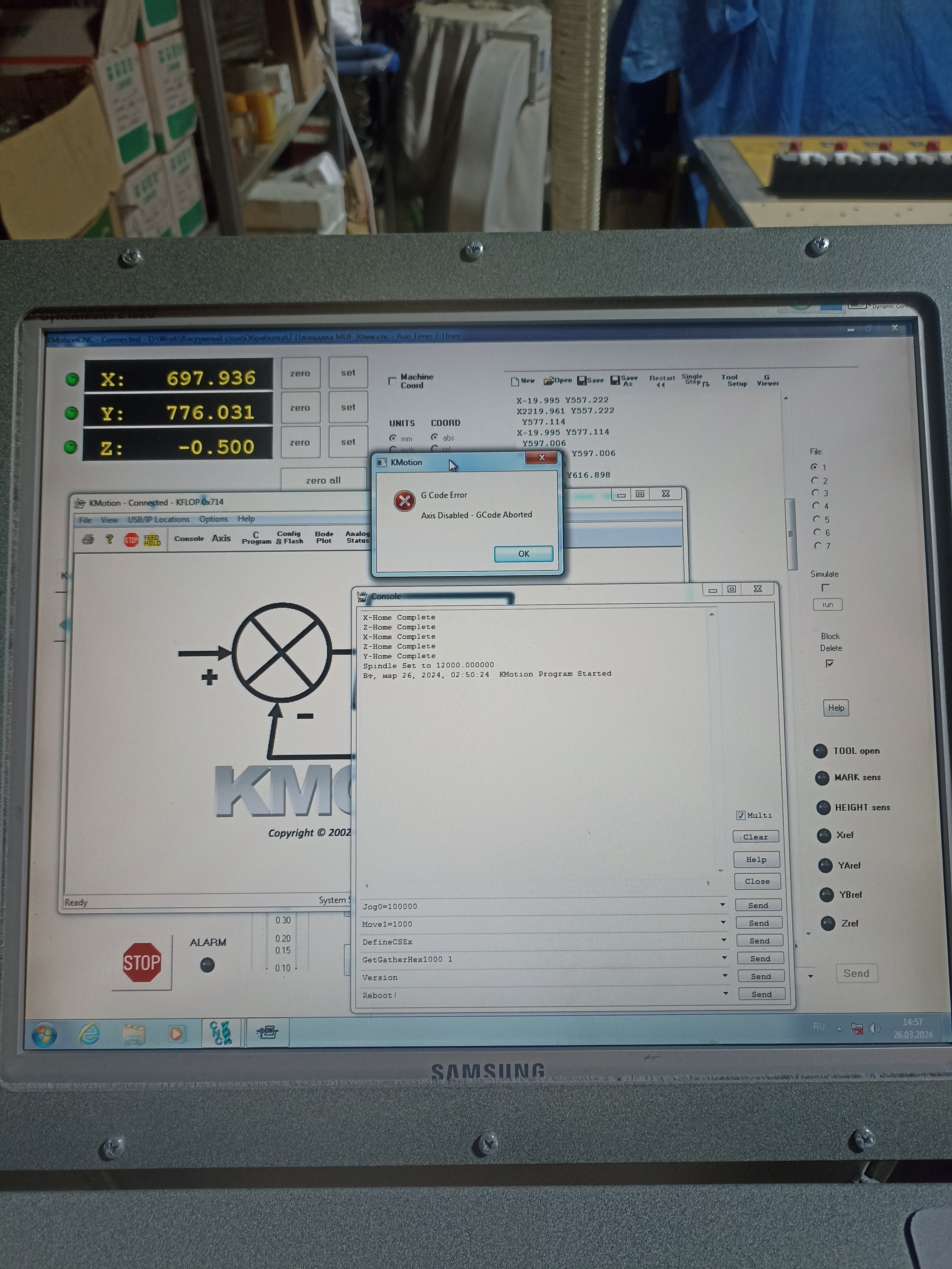 It is indicating the axes are disabled. Are they? Run KMotion.exe and when the error occurs check for any messages on the Console Screen.