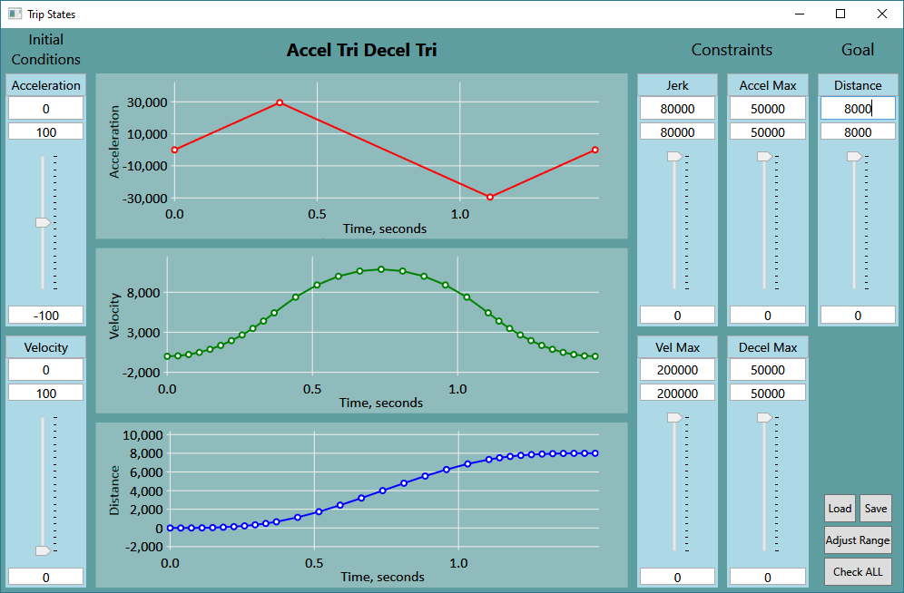 The TripsWPF is a tool we provide for plotting acceleration and velocity for a set of parameters. Here is a plot for your settings