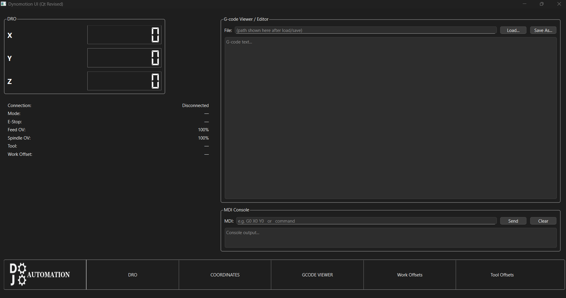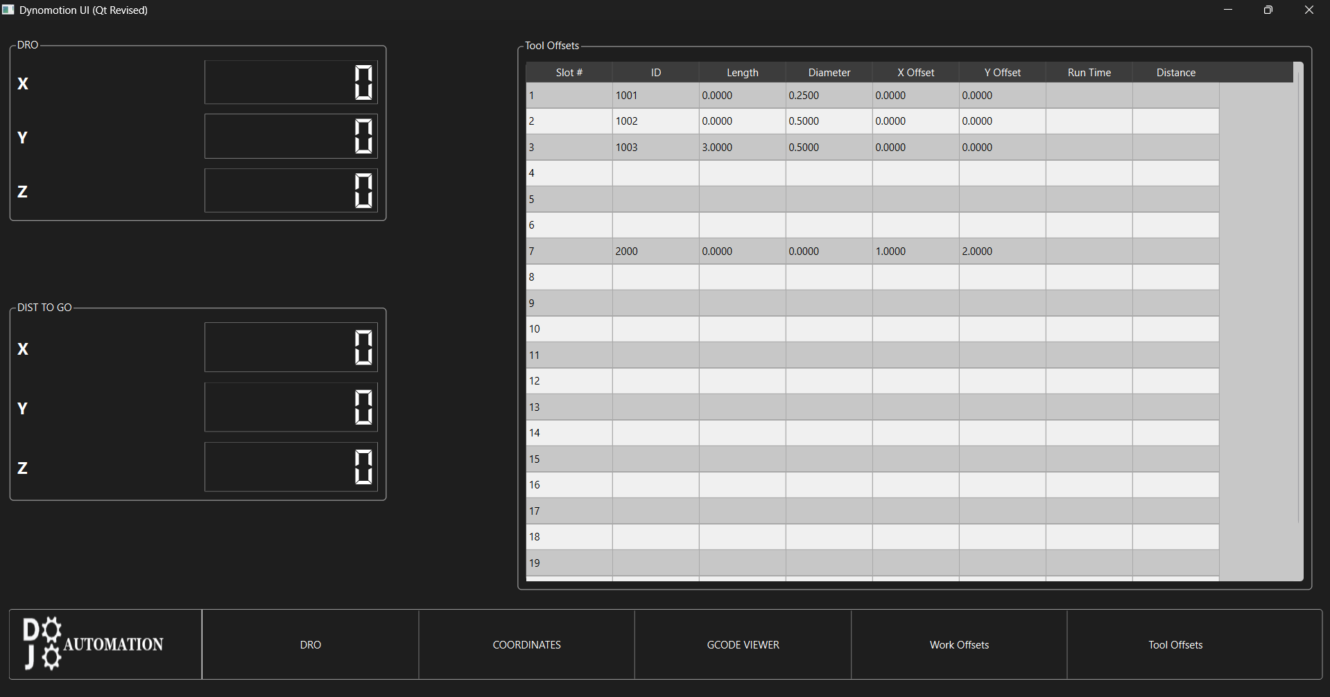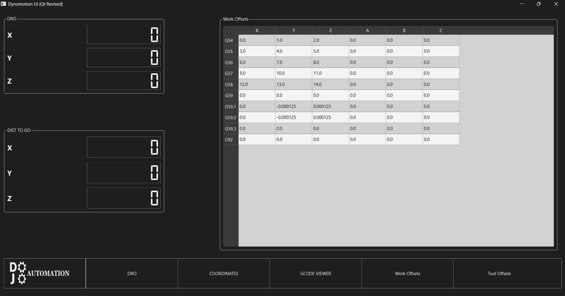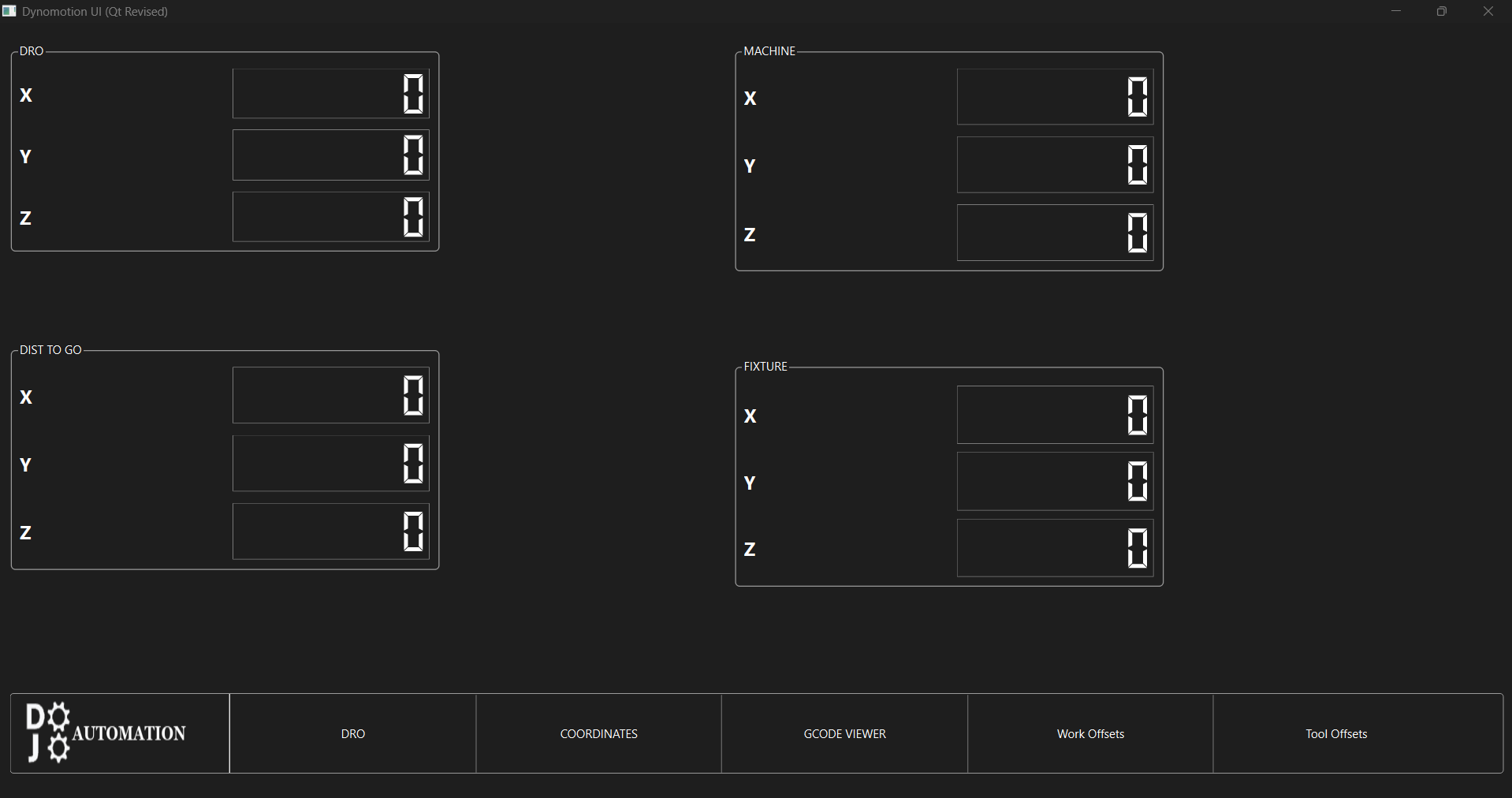 I finally made it where I can use Qt Designer to make UI's and got my UI to start talking to Dynomotion (unfortunately these screenshots are from me running it at home without it connected to the KFlop), I don't expect I've got everything talking correctly on these screens - I did tie in a viewer for G-code as well on a screen. I'm looking forward to putting this on the HMI I received today - I haven't yet checked the coordinates for fixture or the absolute coordinates of the machine - I may need to revise the variables and code I have associated with getting those.