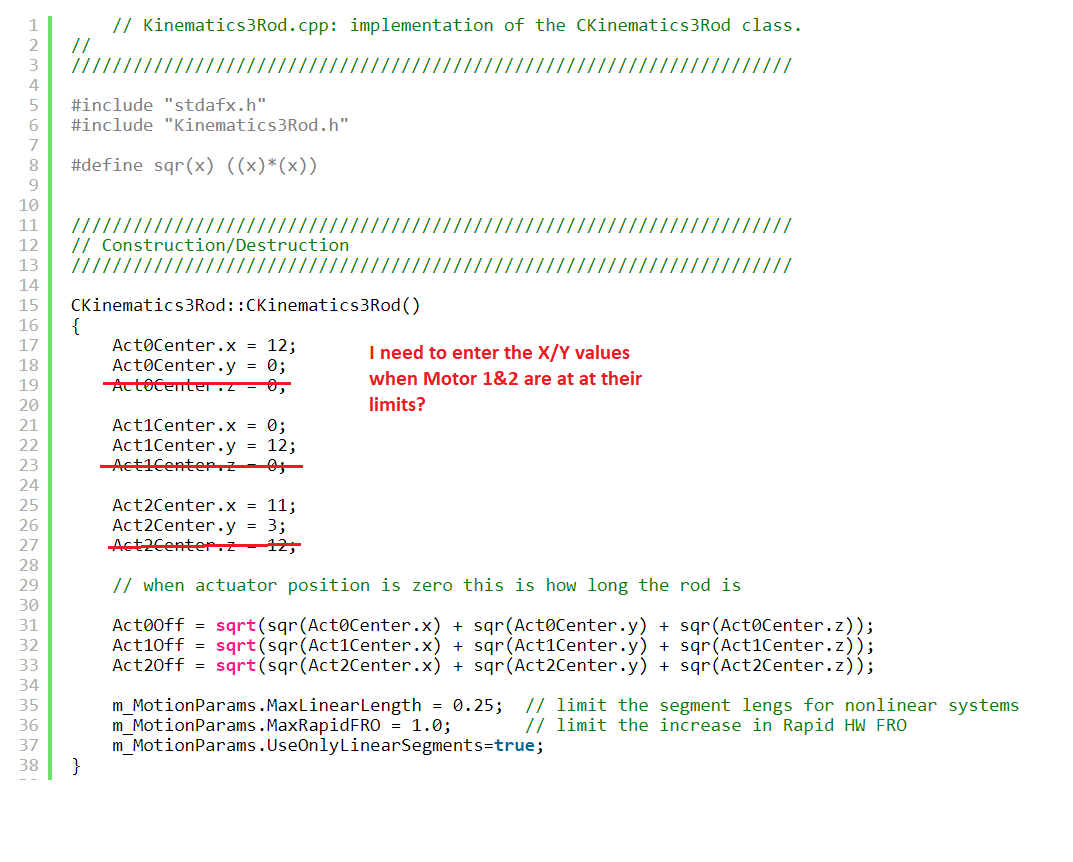 Regarding .cpp file: Restore the TransformCADtoActuators parameters back to what they were. Regardless of what the kinematics are we will always be converting the CAD variables (xyzabc) to Motor positions (Acts[] array).