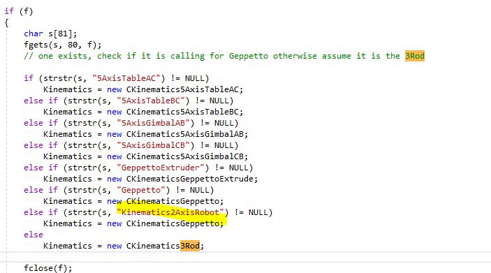 Close, you correctly check for a string match of "Kinematics2AxisRobot" but if there is a match a new CKinematicsGeppetto object is created to be used instead of a CKinematics2AxisRobot object.If so, my next steps are to add "Kinematics2AxisRobot" into CordMotion.cpp like this the attached image?