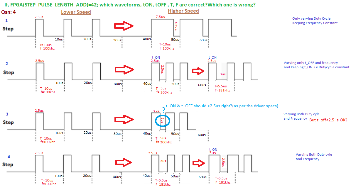 10. If STEP_PULSE_LENGTH_ADD)=1 what is the Pulse width(t_ON), Low Width(t_OFF), Pulse period(T) and Pulse input frequency? Can we set to 1? because, as you told “maximum Step Rate of 2.5MHz”? or else give the example with maximum frequency (with decimal value) we can set.