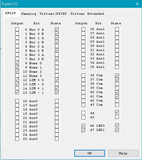 However, if I uncheck all of the output check boxes, it doesn't work any more. There appears to be some conflict between what KFLOP is using those bits for and what KANALOG is using. My guess is that they're assigned to two different things that you can't use at the same time.