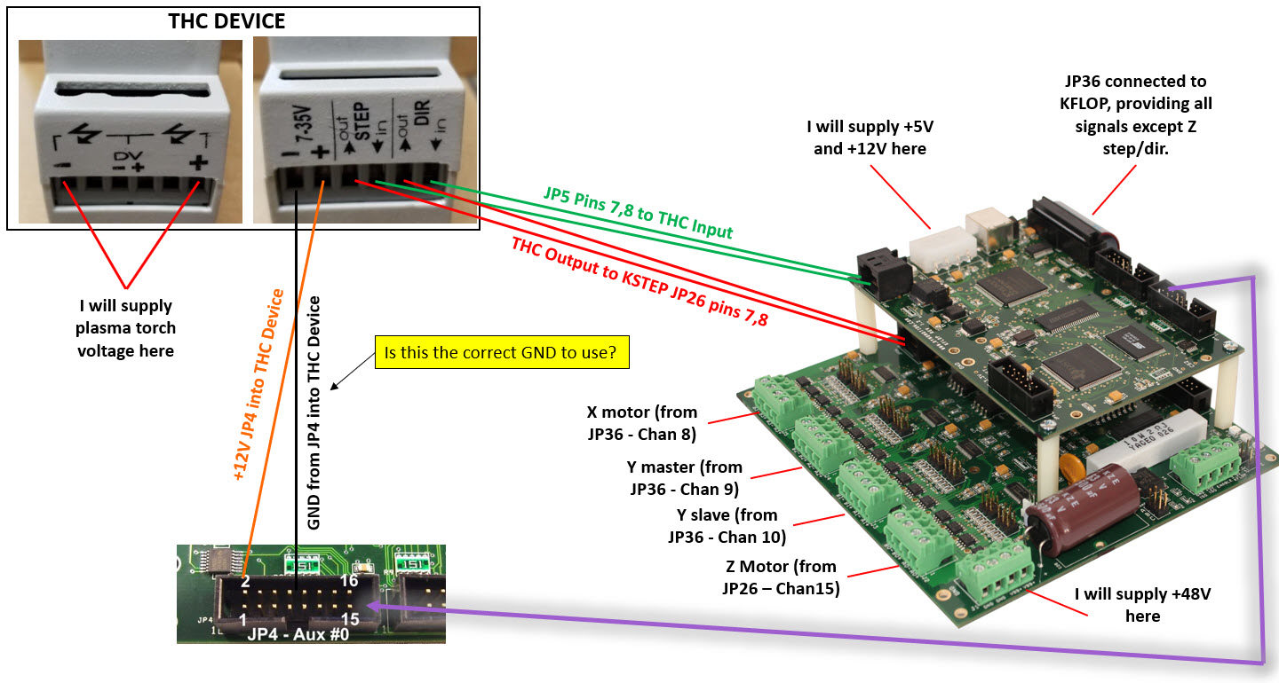 The 4 Step/Dir inputs on KStep have a common GND. The Step/Dir inputs need to be sourced to 2.4V relative to that GND. KFLOP has a common GND with KStep through JP7 - JP36 for this. I didn't see any specification for your plasma device for what kind of output or supplies it needs. If it needs a 5V supply you might use KFLOP's 5V supply or some other separate 5V supply. But either way there must be a GND connection. If the Plasma device is very noisy with the plasma noise not well isolated from its logic GND and you connect that to KFLOP GND then you might have noise problems with KFLOP. Hopefully that is not the case but it is something you should be aware of.I understand your comment about the external device requiring a common GND with KFLOP - but are you also saying that power should be supplied through the KFLOP as well (like via the 12V that can be run through it)? Or if I supply power to it directly from the power supply but ensure common ground is enough?