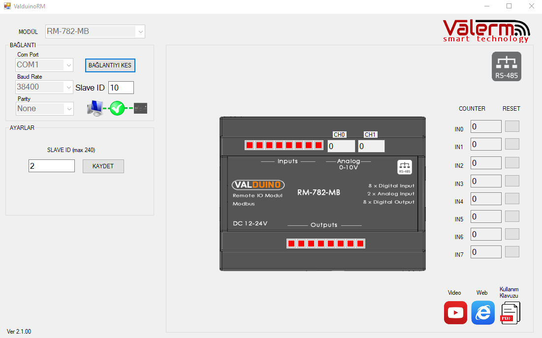 JP12 PIN40 connected to RM782M RS485 GND This VALDUİNO connection software a section source code , I open the Valduino software , select 38400 baudrate - Slave ID 10 and connected, no any problem.