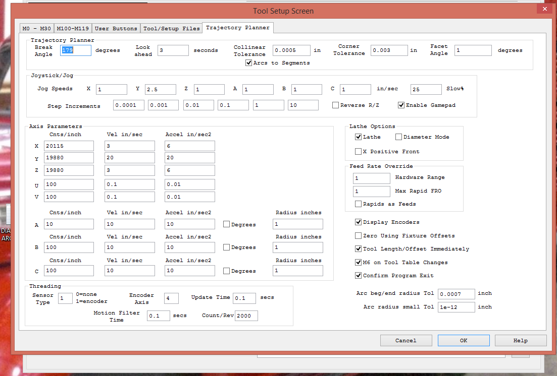 I tried changing the actions to the "Exec/Wait" settings and KMotionCNC did not seem to like that so I changed it back. What I learned after running the lathe with G code programs is that it seems to run as it should dependably until I add the G96 to the program. I think that is introducing some kind of error into KFlop. Even if I take it back out of the code the spindle will not work correctly until I close out and reopen KMotion. Then as long as I do not try using CSS all seems to be good. I have included the shots of tool settings and I think, the requested files. I included 10 attachments with this and will post again with another 5.
