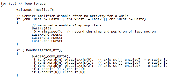When the ESTOP_BIT is active the C Program will send continuous ESTOPS to KMotionCNC. Instead of sending infinite commands to KMotionCNC you might change your code to send only one. Or only send the command if the Axes are enabled.