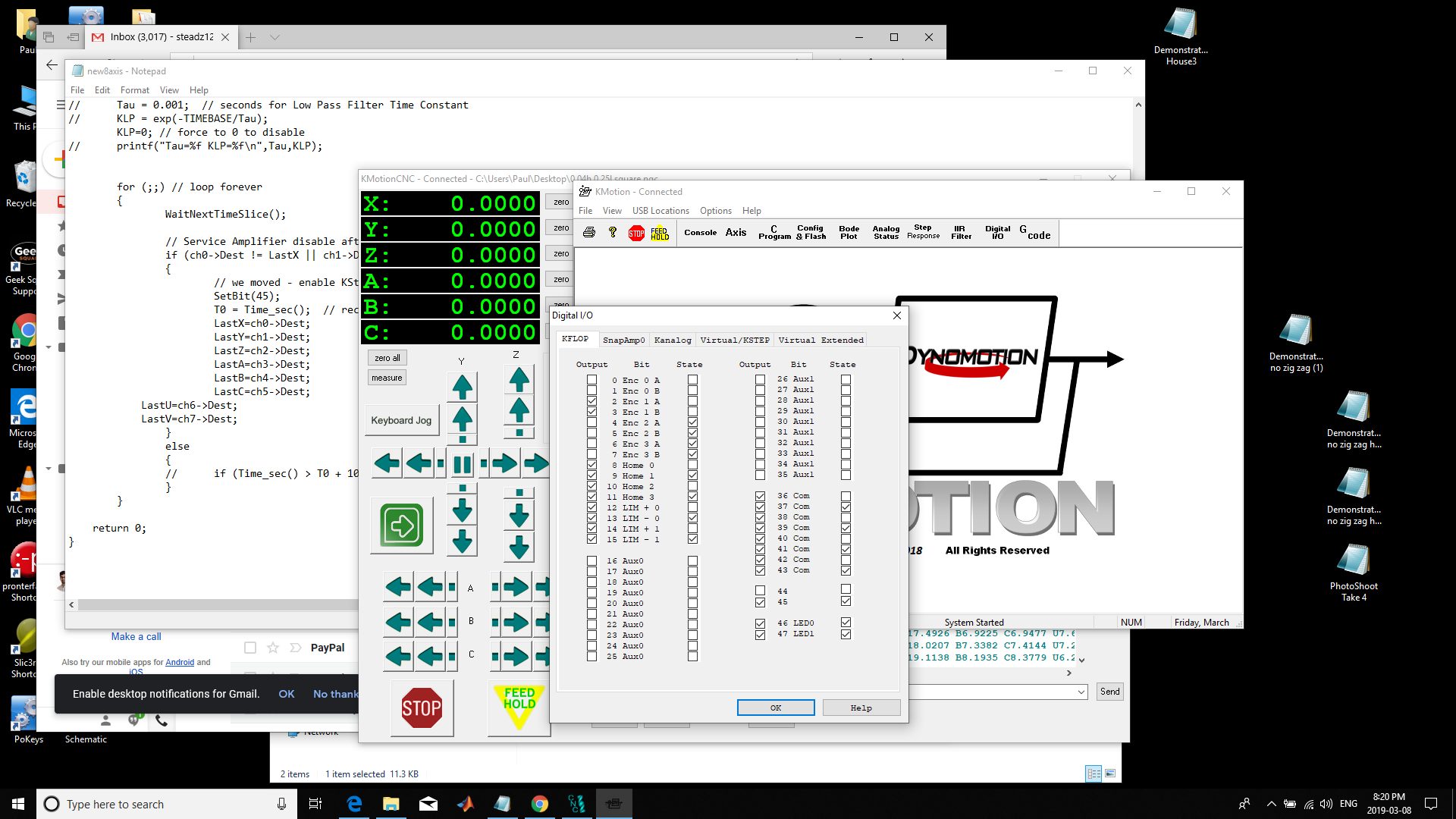 My steppers have 5VDC differential encoders. I am supplying the 5V from an external source. And I am operating my KFLOP with USB power. I am also uploading a screenshot of the digital I/O screen.